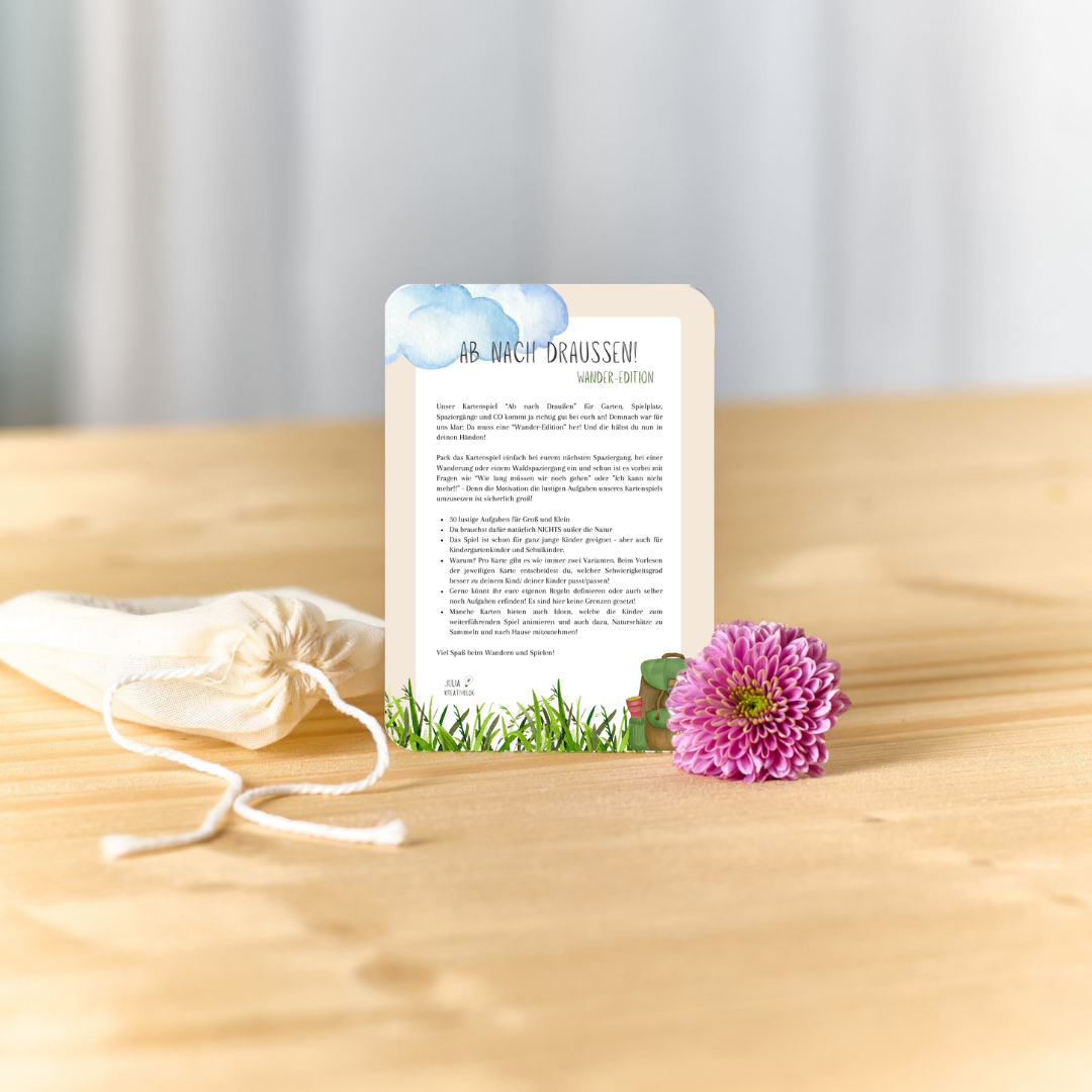Pack das Kartenspiel einfach bei eurem nächsten Spaziergang, bei einer Wanderung oder einem Waldspaziergang ein und schon ist es vorbei mit Fragen wie “Wie lang müssen wir noch gehen” oder ”Ich kann nicht mehr!!” - Denn die Motivation die lustigen Aufgaben unseres Kartenspiels umzusetzen ist sicherlich groß!