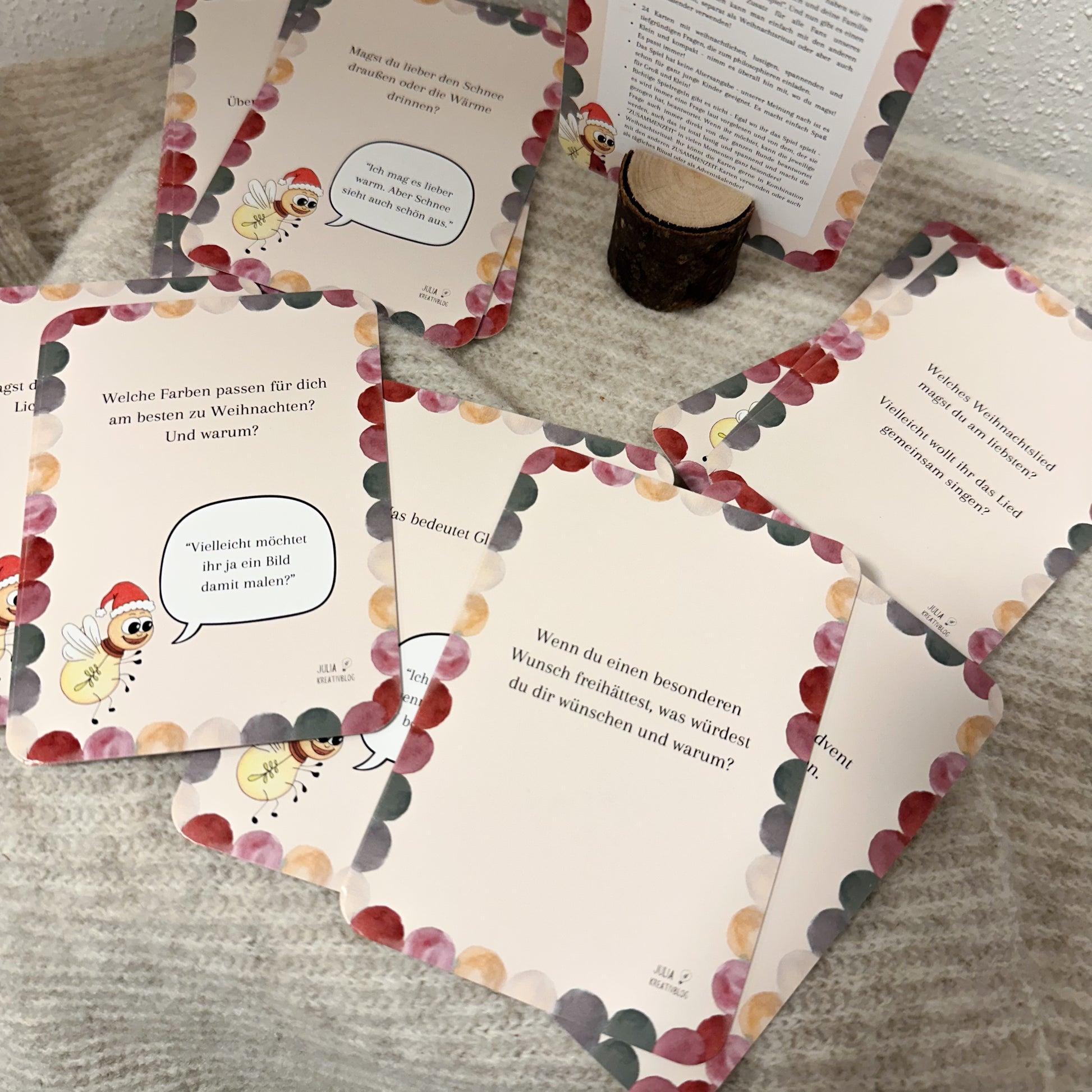 - 24 Karten mit weihnachtlichen, lustigen, spannenden und tiefgründigen Fragen, die zum philosophieren einladen.
