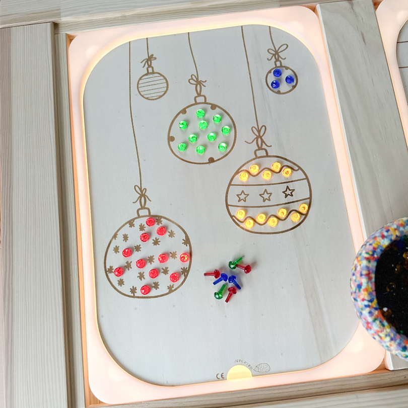 Bei dieser Christbaumkugelplatte kann dein Kind entweder die passenden Steckperlen, Zahnstocher, Pfeifenreiniger oder ähnliche Materialien einstecken, um die Christbaumkugeln bunt zu gestalten. Dabei kannst du auch gleich mit deinem Kind ins Gespräch kommen und über die Weihnachtszeit plaudern.