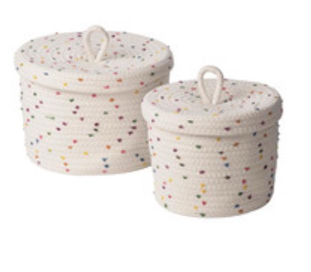 Diese schönen Körbchen mit Deckel fügen sich durch die bunten Punkte einfach in jedes Zimmer ein und machen es ein wenig fröhlicher. Mit dem praktischen Deckel sind alle Dinge schön verstaut.