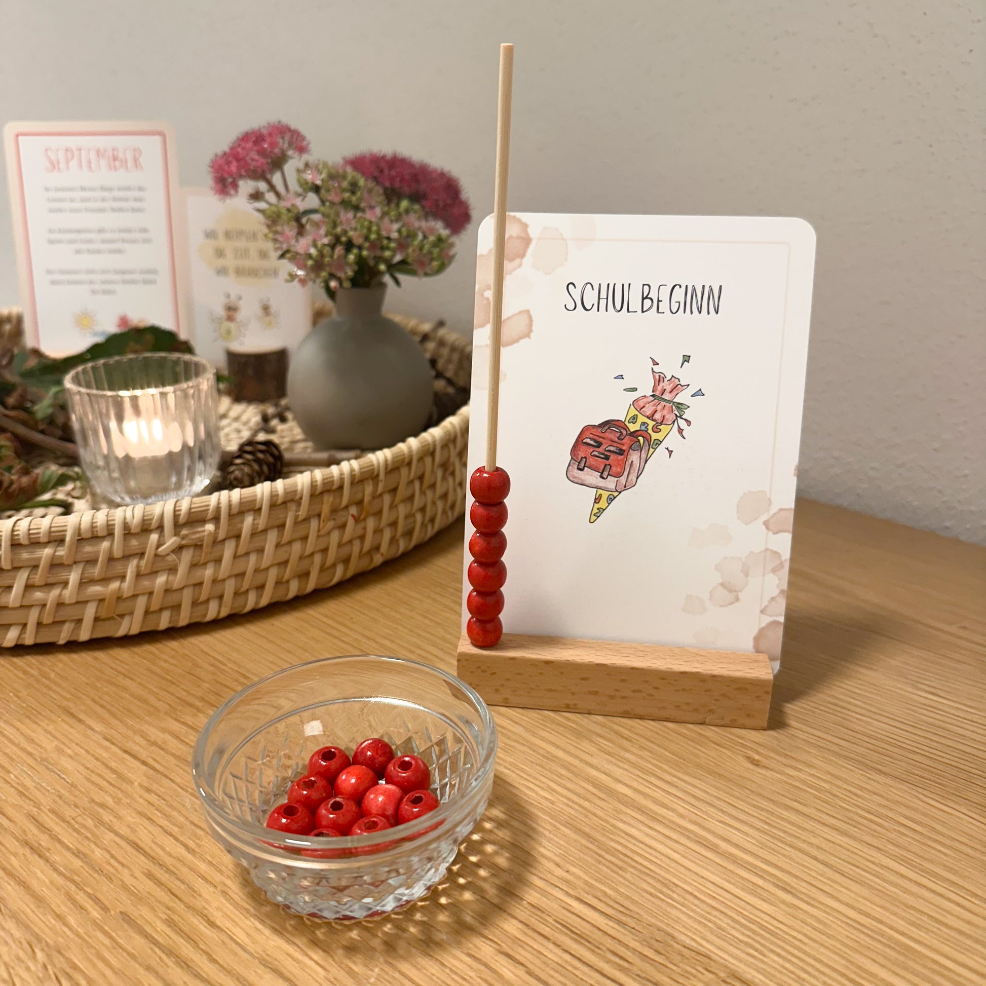Dein Kind steckt einfach die passende Ereigniskarte in den Halter und mit den roten Perlen werden die verbleibenden Tage visuell dargestellt - für jeden Tag der näher rückt, kommt eine Perle weg. So wird klar: Jeder Tag bringt das persönliche Highlight ein Stück näher!