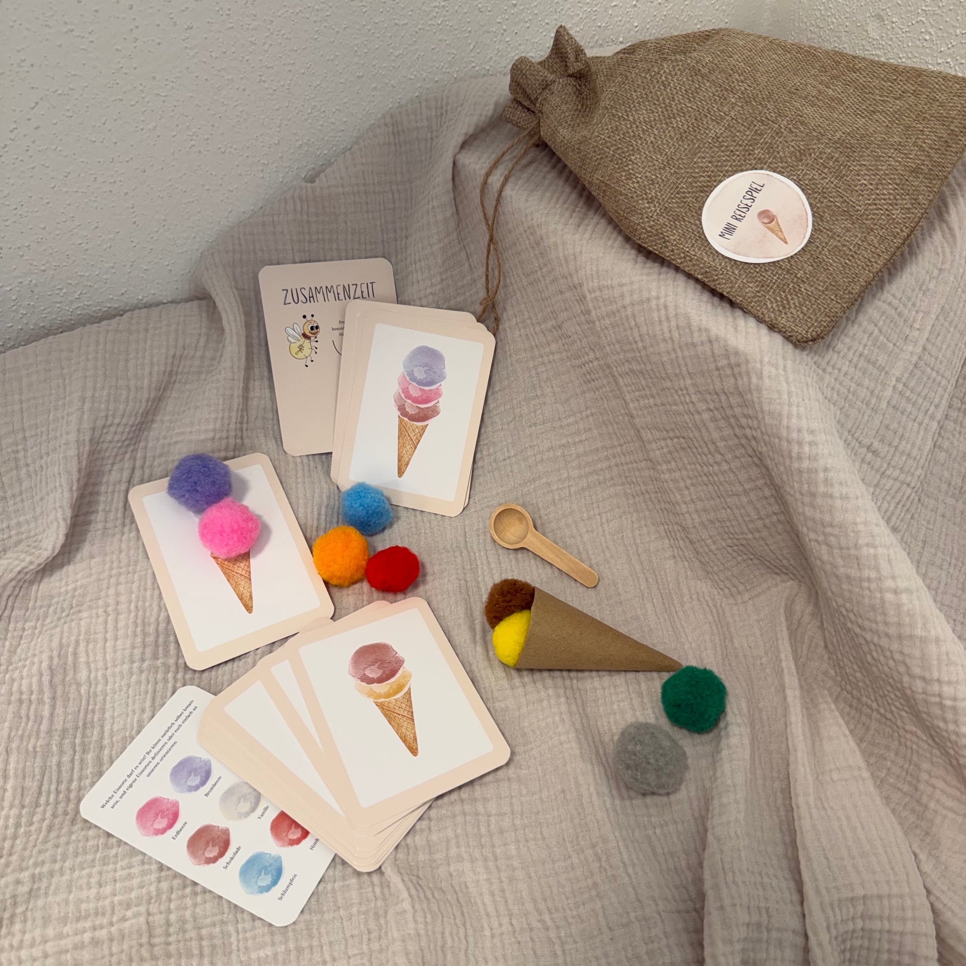 Das Eisdielen-Spiel LIEBT mein Kleiner im Sommer immer! Die Idee für dieses Spiel kam mir genau deswegen - weil mein Kleiner es einfach so sehr liebt, Rollenspiele dazu zu machen! In diesem Spiel bekommst du ein Säckchen, eine Eistüte, einen Eisportionierer aus Holz, viele bunte Pompoms, 9 Klett-Punkte (zum leichteren Spielen unterwegs) und natürlich viele “Eisbestellungs-Karten”.